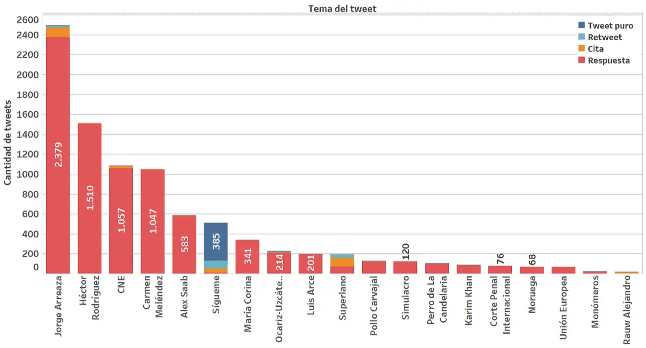 La mayoría de los tweets fueron publicados como respuestas a medios digitales y a líderes influyentes venezolanos.