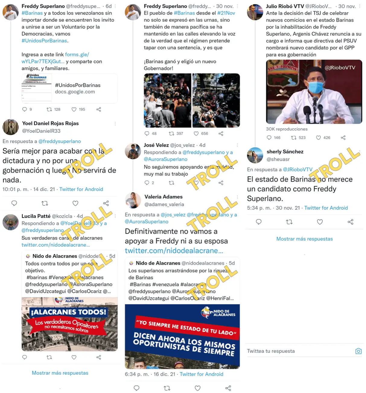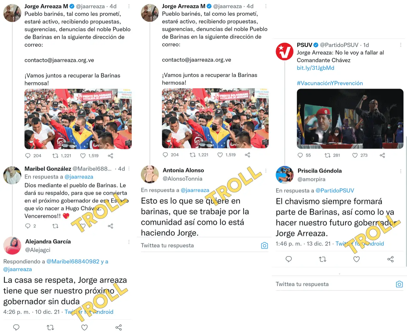 La mayoría de los tweets publicados por las cuentas troll en la campaña por la gobernación de Barinas son respuestas a tweets de otros usuarios. Las cuentas falsas publicaron respuestas a la cuenta en Twitter de Jorge Arreaza y, en menor proporción, a las cuentas del PSUV, de María Gabriela Chávez y de Rosinés Chávez, hijas del expresidente Hugo Chávez Frías, expresando apoyo de forma no auténtica al candidato.