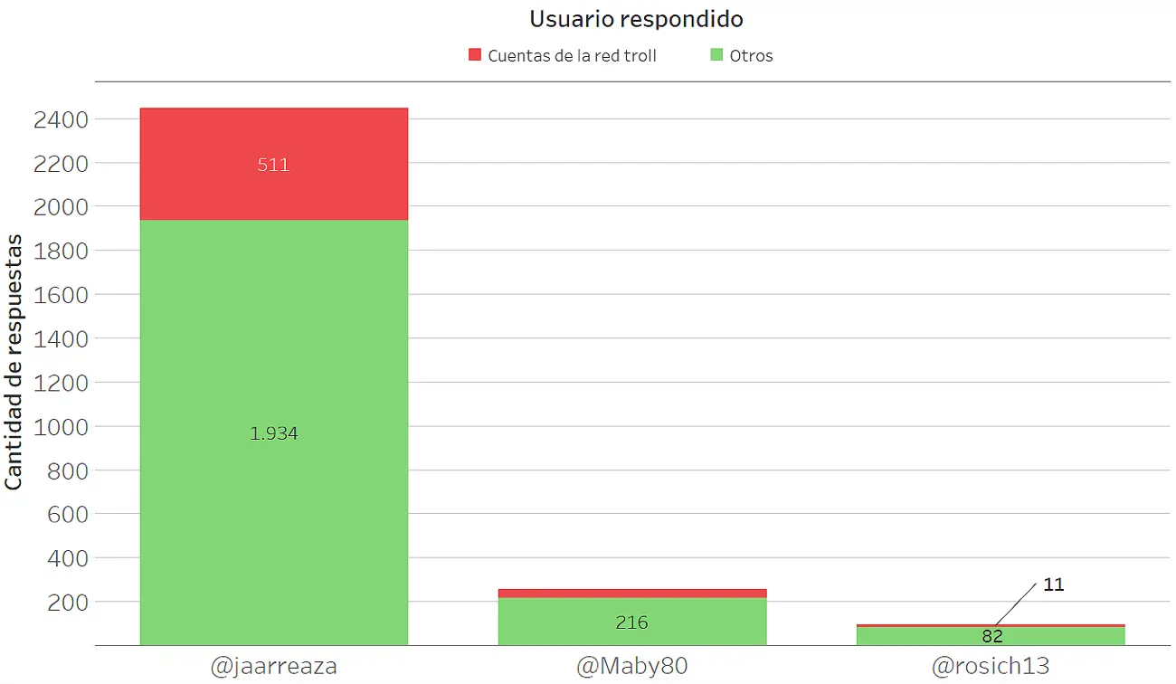 Si bien no todas las respuestas recibidas por cuentas vinculadas con la campaña de Jorge Arreaza fueron publicadas por alguna de las cuentas troll, éstas generaron una importante cantidad de respuestas no auténticas de apoyo al candidato, diluyendo las críticas que muchos otros usuarios de Twitter dirigieron, en forma de respuestas, a los tweets del candidato.