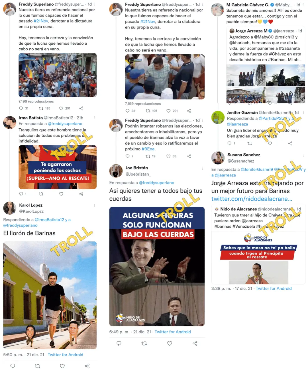 Del 6 al 22 de diciembre de 2021, 117 cuentas de la granja de trolls han participado en la campaña a favor del candidato Jorge Arreaza, ministro del Poder Popular de Industrias y Producción Nacional, quien fue postulado por el Partido Socialista Unido de Venezuela (PSUV, oficialismo) para competir en contra de Sergio Garrido (Plataforma Unitaria, oposición), en la repetición de las elecciones para la gobernación del estado Barinas que será realizada el 9 de enero de 2022.