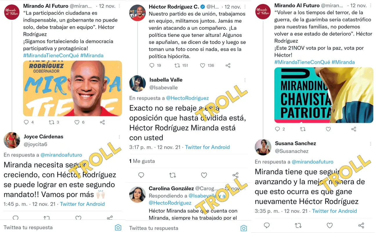 Durante el mes de noviembre, 47 de las cuentas troll se hicieron pasar por partidarios de Carlos Ocariz (Plataforma Unitaria, oposición) y David Uzcátegui (Fuerza Popular, oposición), quienes buscaban capitalizar el voto opositor en la pugna electoral para la gobernación del estado Miranda.