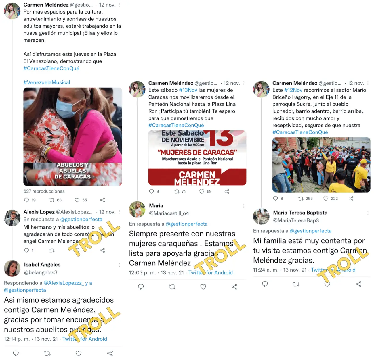En el caso de Rodríguez y Meléndez, las características de los tweets publicados por las cuentas de la red troll, son similares a los publicados por la misma red en la campaña a favor de Jorge Arreaza en Barinas: tweets propagandísticos, imitando a votantes reales, publicados como respuestas a tweets de cada candidato o a otras cuentas vinculadas con sus respectivas campañas.