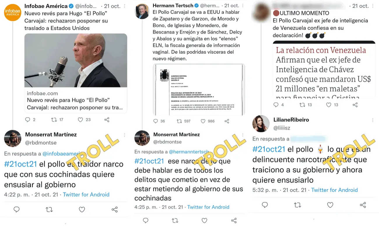 Algunas de las cuentas troll publicaron respuestas solicitando la extradición de Carvajal a Estados Unidos, aprobando el desarrollo del juicio al que se enfrenta en España o exigiendo que también sea enjuiciado por su presunta relación con el narcotráfico.