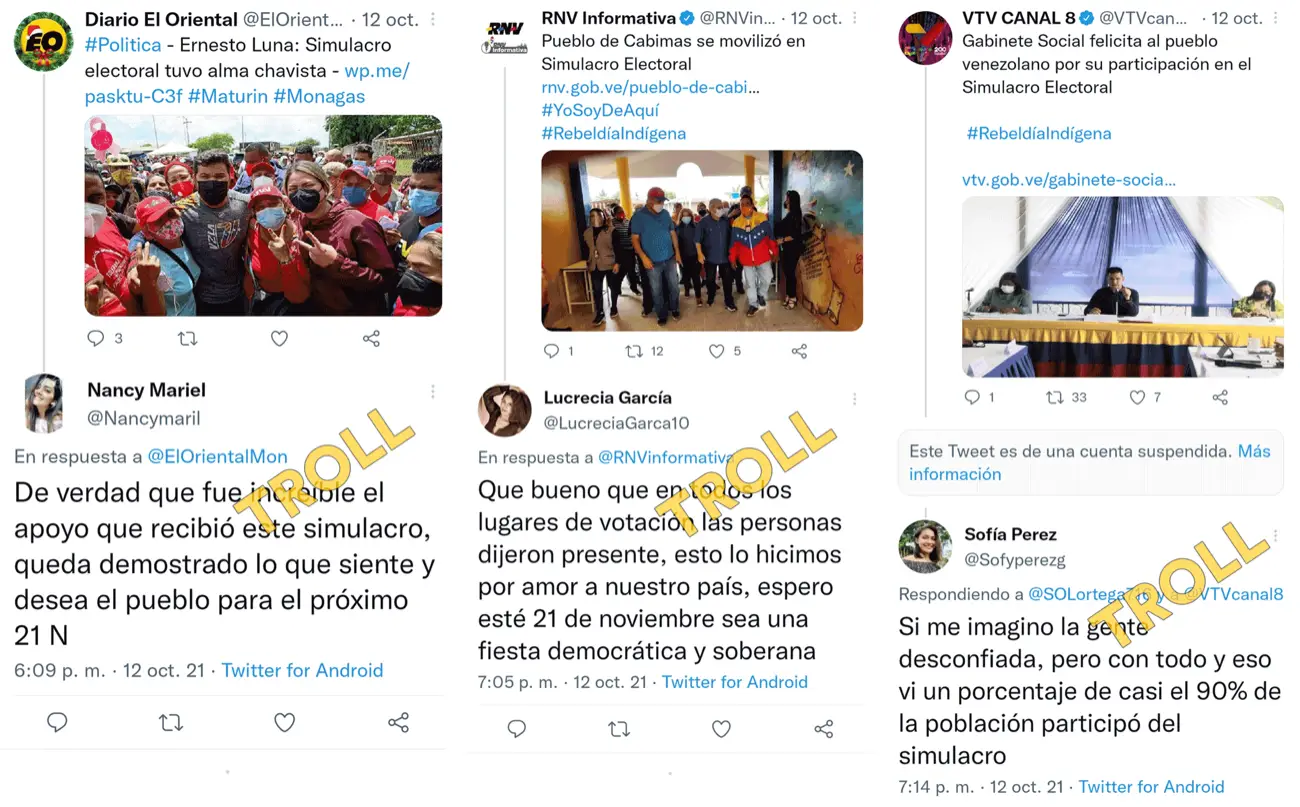 De igual forma, participaron en la manipulación de temas políticos y sociales en Twitter, previos a la cita electoral. Respondieron a publicaciones de medios de comunicación digitales y de tuiteros influyentes, con el propósito de influenciar la conversación sobre temas de interés nacional como la confianza en el Consejo Nacional Electoral y en las elecciones regionales de noviembre, el proceso de diálogo venezolano en México y la credibilidad del proceso que lleva Venezuela ante la Corte Penal Internacional.
