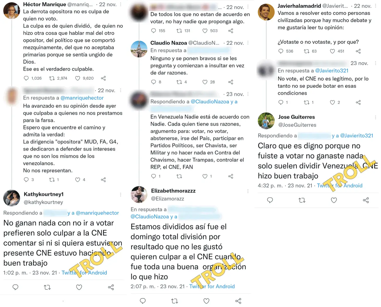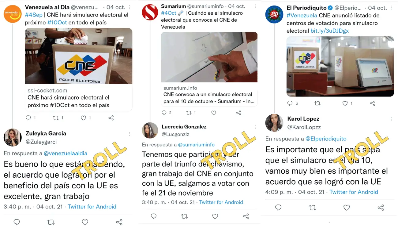 En algunos casos, las cuentas trolls se hicieron pasar por opositores que señalaban que, a pesar de no tener confianza en el Consejo Nacional Electoral (CNE), ejercerían su derecho al voto debido a la presencia de la MOE UE en el país.