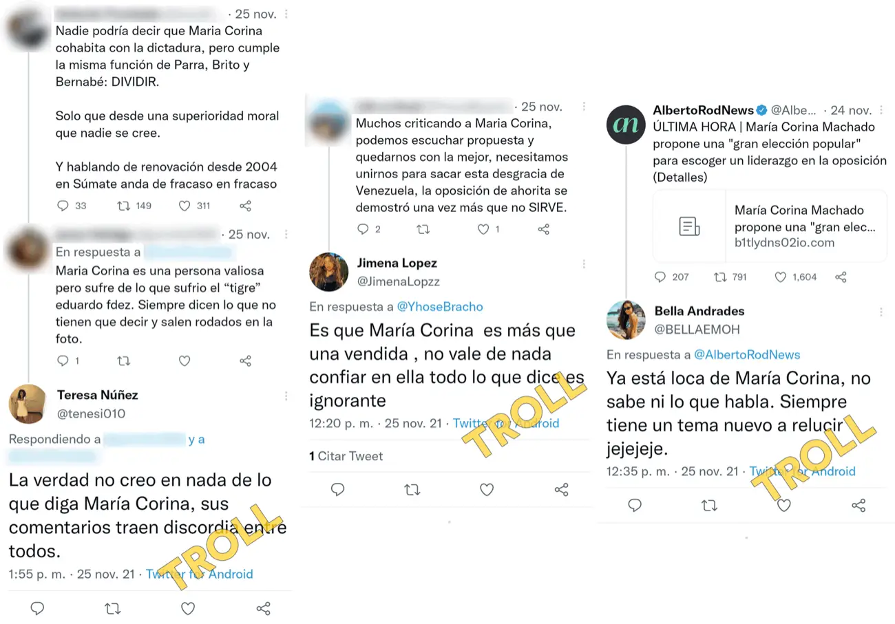 A finales del mes de noviembre, 56 de las cuentas troll publicaron al menos 333 tweets en los que mencionaron a la dirigente María Corina Machado (Vente Venezuela, oposición).
