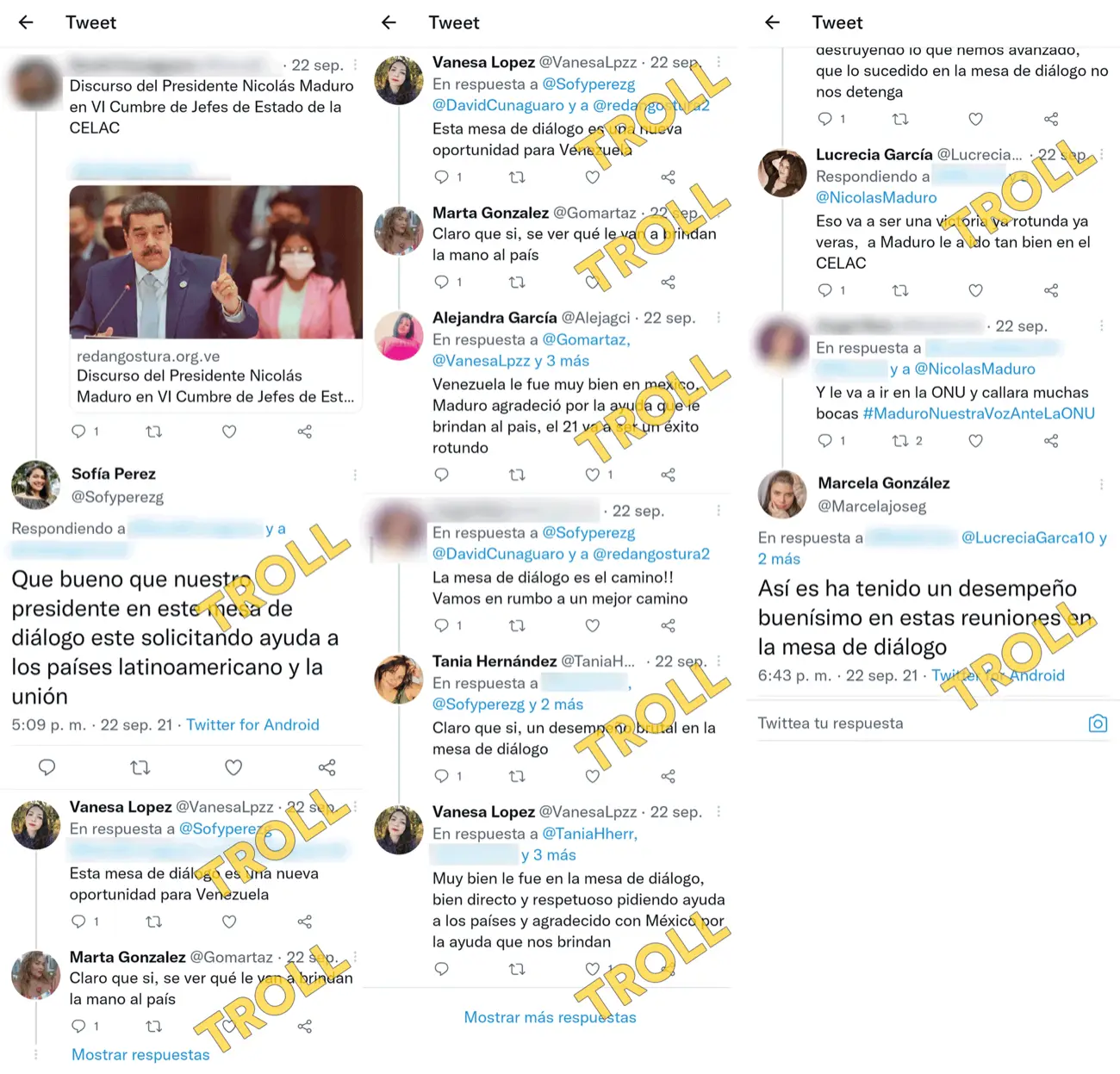 Entre el 16 y el 30 de septiembre, 51 cuentas troll publicaron 266 tweets apoyando el proceso o la mesa de diálogo en México. Varias de las cuentas felicitaron las declaraciones de Nicolás Maduro sobre el proceso y apoyaron a la solicitud del oficialismo venezolano de incorporar al empresario colombiano Alex Saab, en ese momento detenido en Cabo Verde, como uno de los miembros de la comisión que participó en las conversaciones.