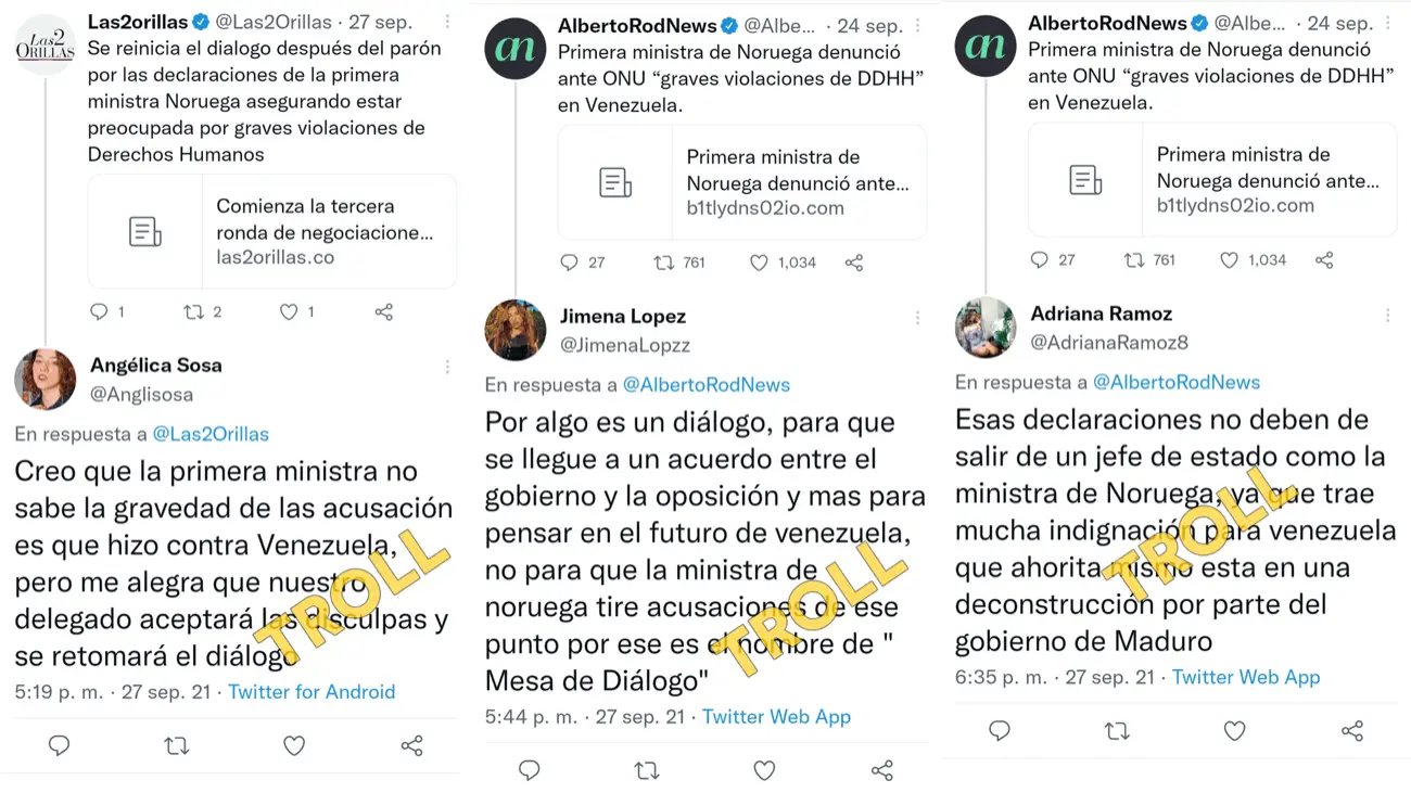 El 27 de septiembre, 23 cuentas de la red troll publicaron 65 tweets, haciéndose pasar por venezolanos que rechazaban las declaraciones de la representante noruega.