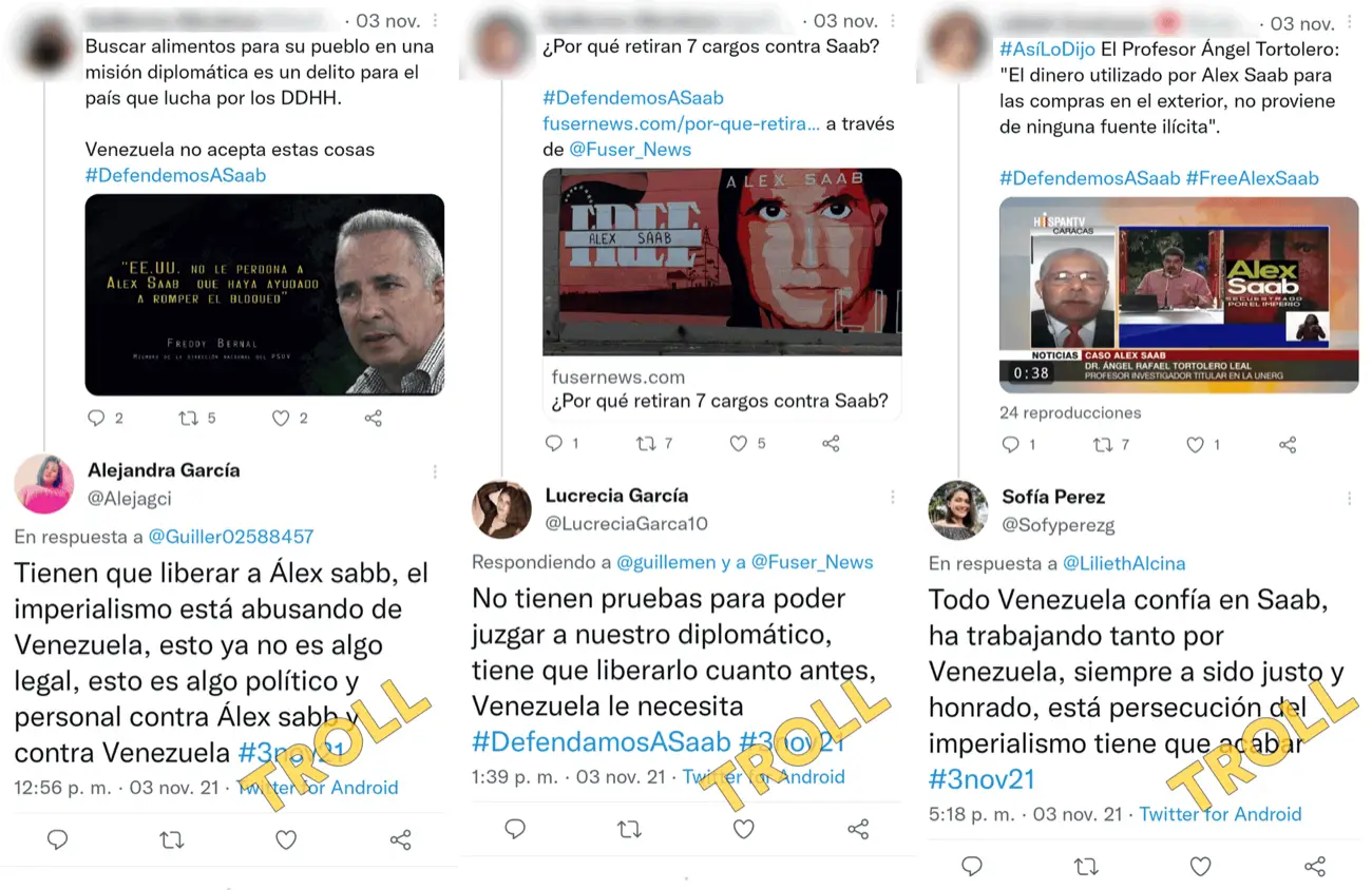 Entre el 20 de septiembre y el 9 de noviembre de 2021, 95 cuentas troll publicaron 530 tweets relacionados con Alex Saab, principalmente pidiendo su liberación o mostrando apoyo al empresario colombiano, de forma no auténtica.
