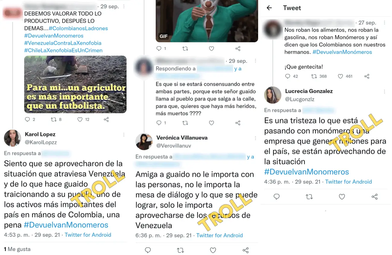 El 29 de septiembre de 2021, 7 cuentas troll publicaron 24 tweets relacionados con el caso Monómeros, 11 de los cuales contenían la etiqueta #DevuelvanMonomeros, que fue propuesta como “etiqueta del día”, el 27 de septiembre, por la cuenta del Ministerio para el Poder Popular para la Comunicación e Información (MIPPCI) de Venezuela.
