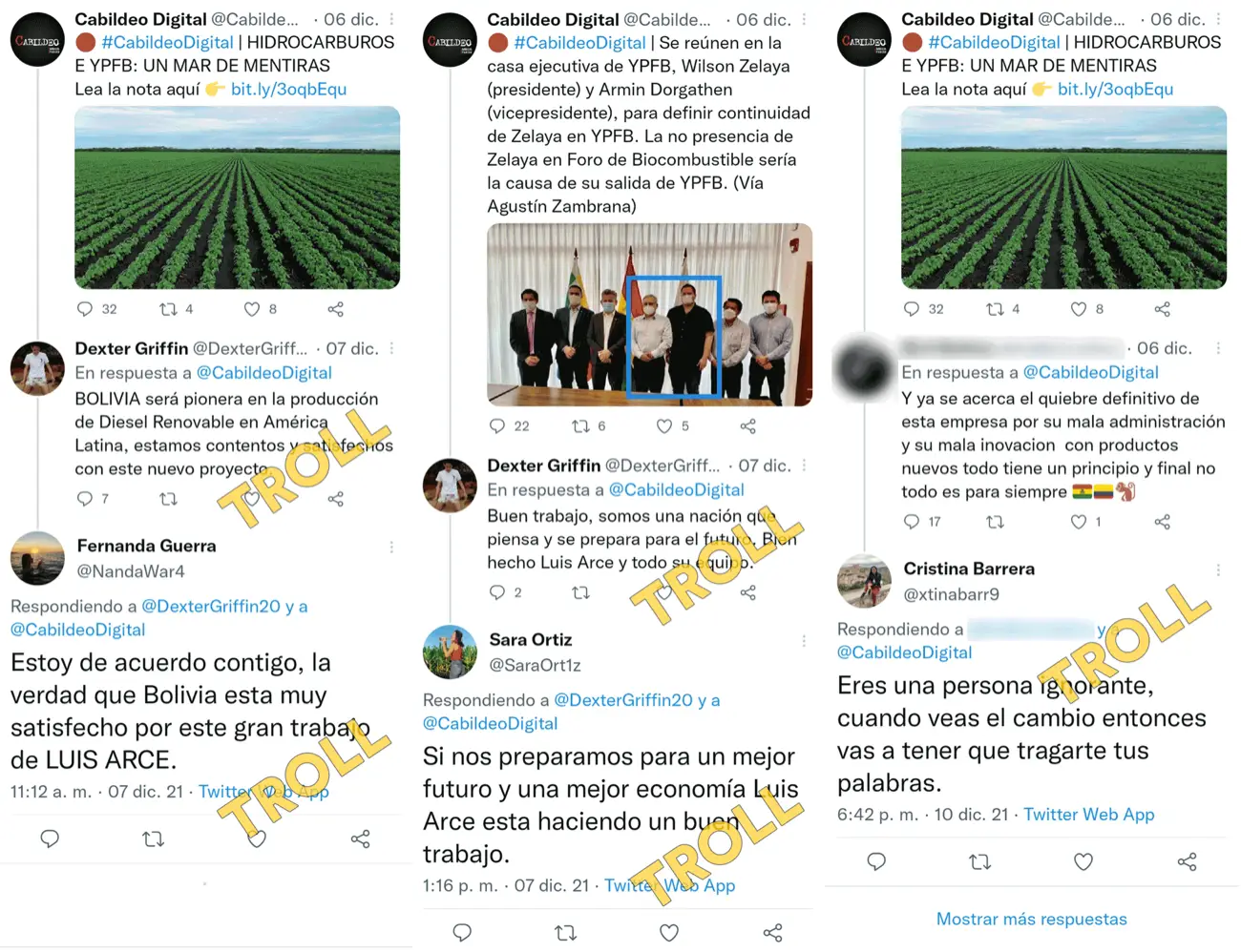 El 3 de diciembre de 2021, 10 cuentas troll pertenecientes a la red, publicaron 68 tweets con contenido propagandístico a favor de Luis Arce, actual presidente de Bolivia.