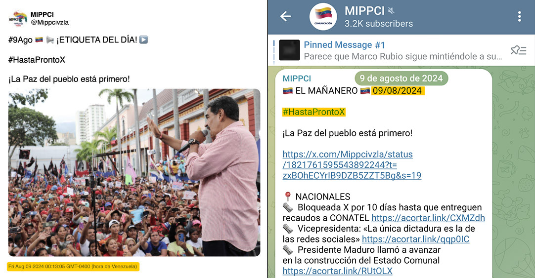 The last known post from this profile, when it was still using the handle @Mippcivzla—shared through Mippci’s Telegram channel and is archived in the Wayback Machine— is dated August 9, 2024. In that post, the ministry promoted the hashtag #HastaProntoX (#SeeYouLaterX), linked to the decision by official accounts to stop publishing content on the platform, following a proposal by Conatel to temporarily suspend the use of X for an initial period of 10 days.