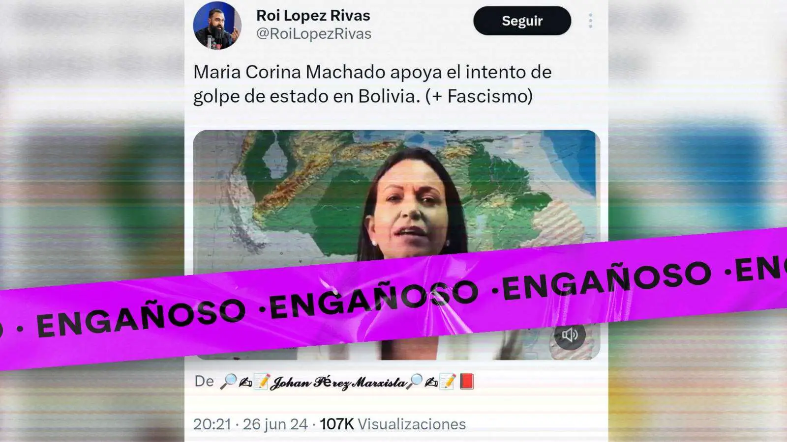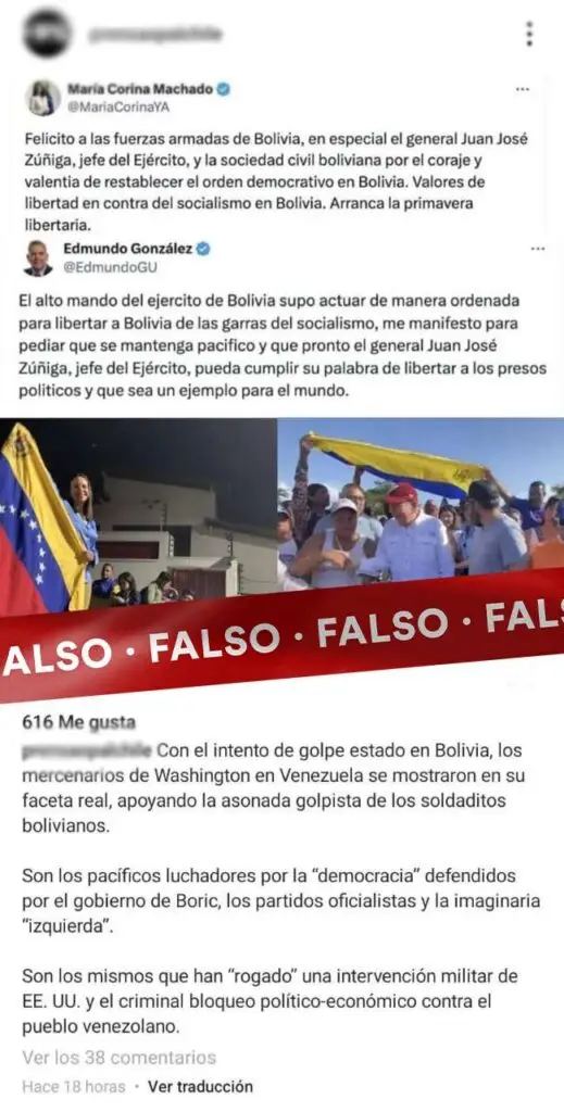 Cuentas propagadoras de desinformación difundieron este 26 de junio del 2024 un video en el cual María Corina Machado, presuntamente, apoyaría el intento de golpe de Estado en Bolivia encabezado por el ahora excomandante de general del Ejército de ese país, general Juan José Zúñiga.