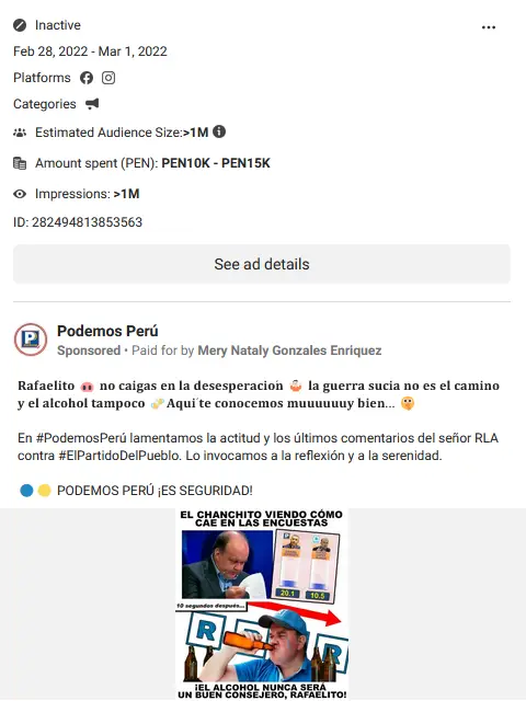 Desde enero del 2019 a mayo de 2023, según los registros de la librería de anuncios de Meta, más de 13.000 cuentas creadas en Facebook e Instagram invirtieron un total de S/ 20’887.000 en anuncios de contenido político o social en Perú. Solo seis perfiles—todos vinculados al partido Podemos Perú—concentraron el 44% (S/ 9’267.000) del total publicitado. Estas sumas de dinero fueron destinadas a Meta para promover candidaturas y mensajes de los principales representantes de esta agrupación.