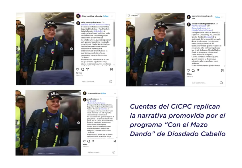 El 19 de marzo, a través de la transmisión vía el canal del Estado (VTV) se promovió la tendencia #BukeleCachorritoYLacayo en X, generando al menos 8.790 publicaciones de acuerdo a nuestro registro. La campaña fue replicada en Instagram por cuentas vinculadas al Cuerpo de Investigaciones Científicas, Penales y Criminalísticas, CICPC, que compartieron imágenes de Cabello recibiendo vuelos de migrantes y reforzando la narrativa de protección a estos. Al mismo tiempo, rechazaron los acuerdos entre EE.UU. y El Salvador para deportar venezolanos, etiquetando directamente al programa en sus publicaciones.