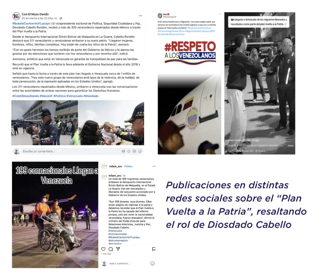 También identificamospublicaciones sobre el Plan Vuelta a la Patria promovidas por el oficialismo en TikTok, X, Instagram, y Facebook que reforzaban la imagen de Diosdado Cabello y el régimen “rescatando” a los migrantes venezolanos, siendo una narrativa que se encontró en cerca de 273 publicaciones de las más de 6 mil identificadas por ProBox en la búsqueda de palabras claves y etiquetas utilizadas para promover las narrativa de rescate a migrantes y rechazo a las políticas migratorias estadounidenses.