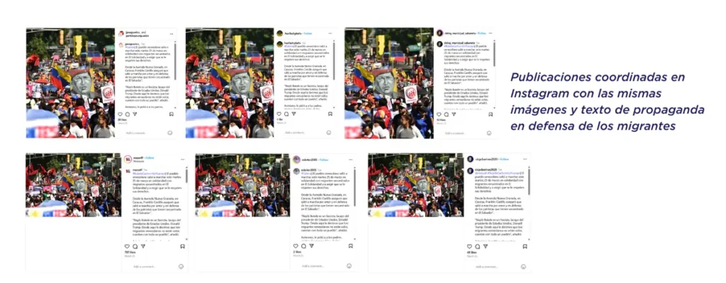 Nicolás Maduro también es promovido como “defensor” de los migrantes y, al igual que con Cabello, se usó un comportamiento coordinado para impulsar esta narrativa con actos realizados a favor de los migrantes; especialmente en Instagram, donde encontramos al menos 10 publicaciones que utilizan exactamente el mismo texto para acompañar sus imágenes, incluyendo una publicación de “Con el Mazo Dando” y dos publicaciones de cuentas del CICPC que replican de forma idéntica el contenido.