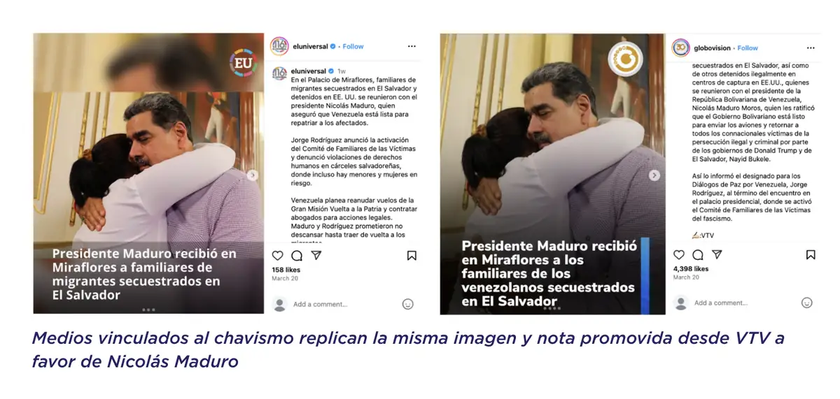 A esta actividad en Instagram, se suma la de cuentas de medios proxy alineadas al oficialismo (medios que aparentan ser independientes y operar por sus propios intereses, pero que en realidad están influenciados, financiados o controlados por un gobierno para difundir mensajes y dar forma a la opinión pública en su favor), en una campaña de propaganda que buscaba difundir la imagen positiva de Maduro ante la visita al Palacio de Miraflores de familiares de venezolanos trasladados a El Salvador; intentando dibujar a un gobierno compasivo y replicando la imagen de Maduro abrazando a la madre de uno de los detenidos en ese país, haciendo énfasis en que estos venezolanos “están secuestrados”.