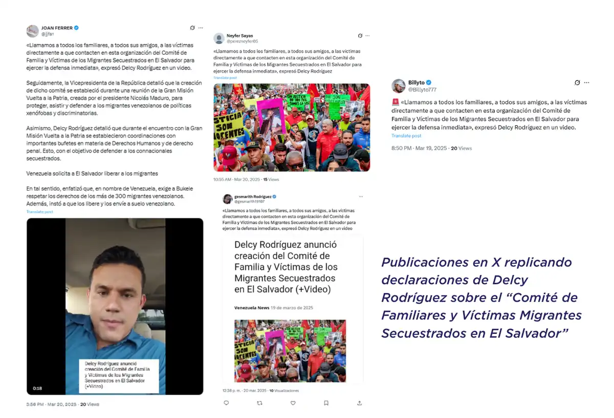 La participación de los hermanos Rodríguez en el tema se centró en la creación del “Comité de Familiares y Víctimas Migrantes Secuestrados en El Salvador”. Jorge Rodríguez hizo el anuncio, que fue difundido en instagram por medios proxy como Globovisión, El Universal, Diario Panorama, Noticias Calabozo, El Foco, EsConUsted.Com, Noticias Cada Día, Mérida Es Noticia, y CNT Noticias. También se registraron publicaciones destacando a Delcy Rodríguez como promotora del comité, con menciones en X como esta de Primicias 24 y un video en TikTok en la cuenta TV FANB.