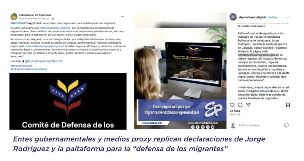 La promoción de la página del comitedefensamigrantes.gob.ve se vinculó a la figura de Jorge Rodríguez, en Instagram, Facebook y TikTok, con publicaciones en las que se cita a Rodríguez promoviendo el uso de la plataforma para que los migrantes venezolanos en Estados Unidos se registren, hagan denuncias, compartan testimonios y coordinen acciones con el Estado venezolano para su retorno al país.