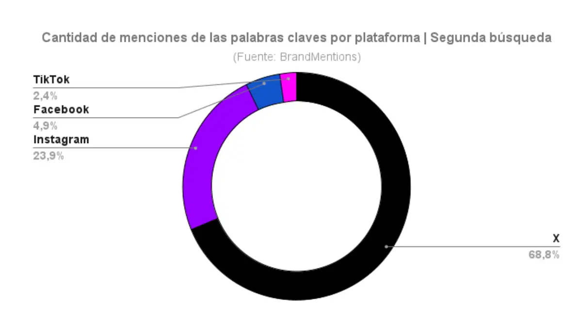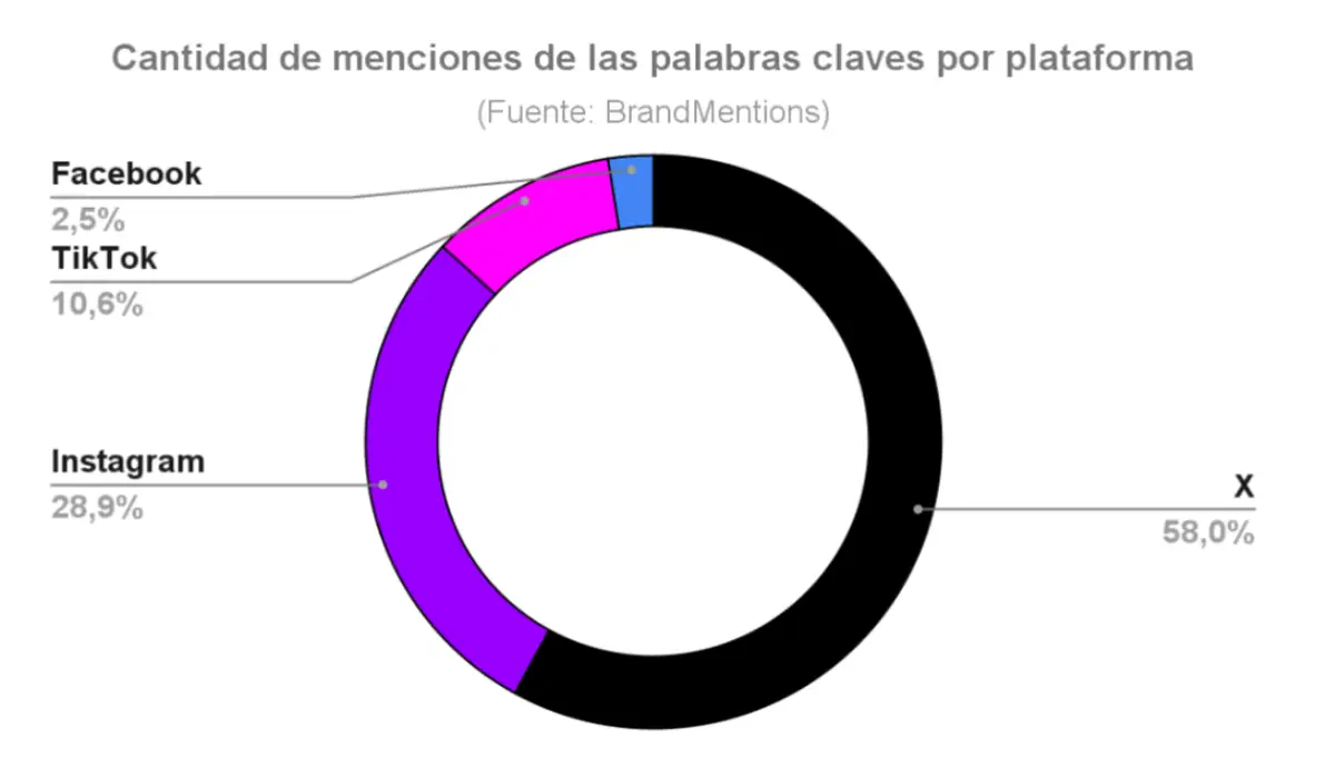 Los resultados evidencian que 58% de la conversación (3.684 menciones) se desarrolló en X, seguido por Instagram con el 28,94% (1.838 menciones), TikTok con el 10,56% (671), y por último Facebook con el 2,50% (159).