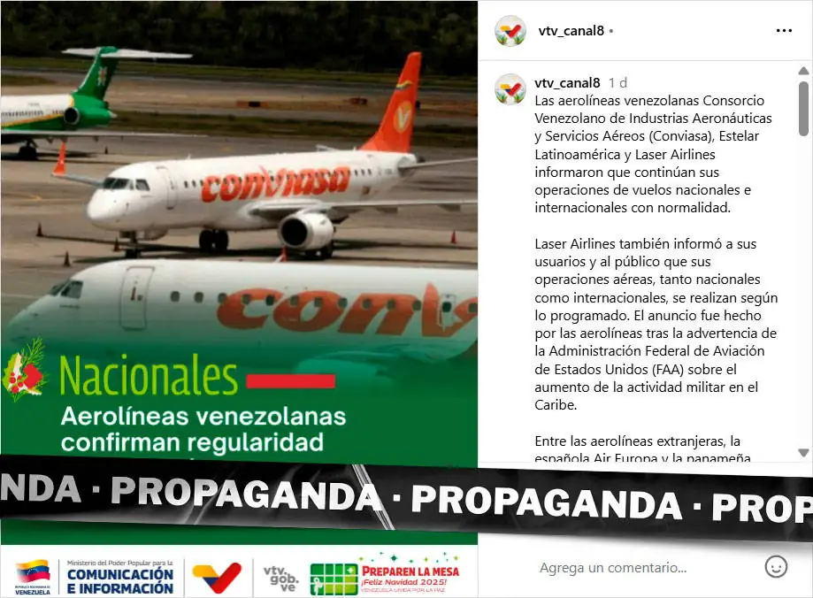 Varios de estos contenidos de “propaganda tranquilizadora” están siendo impulsados y amplificados en el Sistema Bolivariano de Comunicación e Información (Sibci), la red de medios públicos coordinada directamente con el Ministerio del Poder Popular para la Comunicación e Información (Mippci). Luego de que ocho aerolíneas suspendieran sus operaciones en Venezuela (Iberia, TAP, GOL, Avianca, Air Europa, Plus Ultra, Turkish Airlines y Latam Airlines), el canal Venezolana de Televisión (VTV) destacó que Conviasa, Estelar y Laser Airlines “continúan sus operaciones de vuelos nacionales e internacionales con normalidad”.