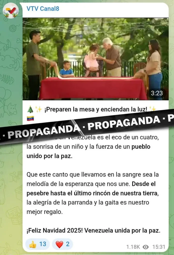 Además de intentar proyectar positivamente la imagen de Maduro, también se difunden contenidos alusivos a la Navidad y las celebraciones decembrinas, que buscan reforzar un ambiente de tranquilidad y normalidad en Venezuela. Ejemplo de esto es una publicación de VTV en su canal de Telegram en la cual desean Feliz Navidad, con un video que se titula “La Navidad en Venezuela es el eco de un cuatro, la sonrisa de un niño y la fuerza de un pueblo unido por la paz”.