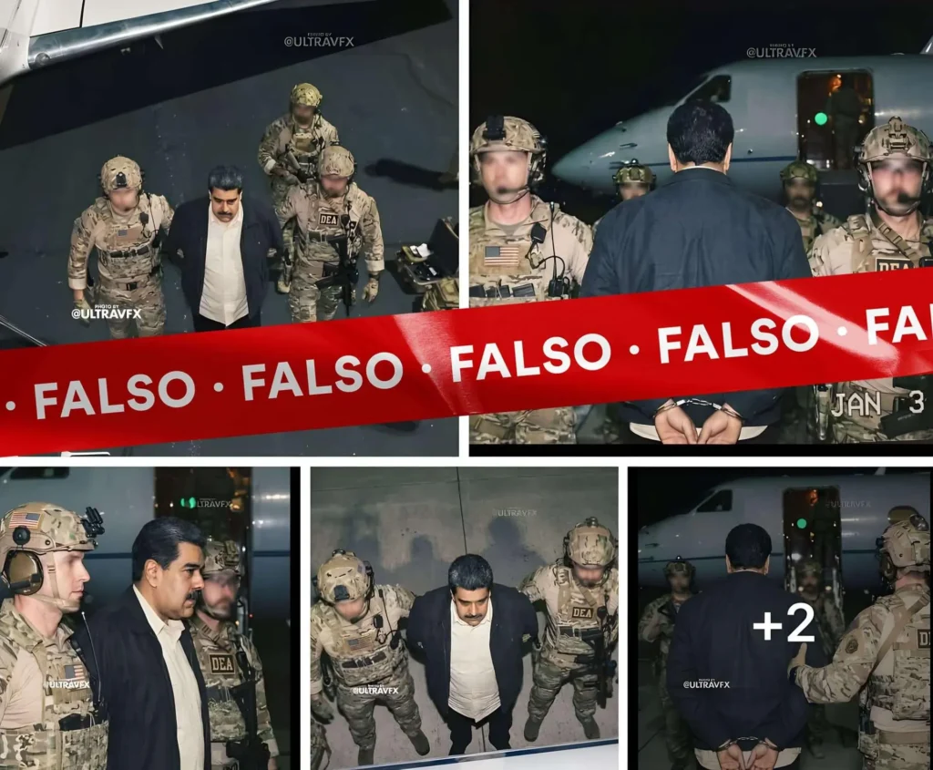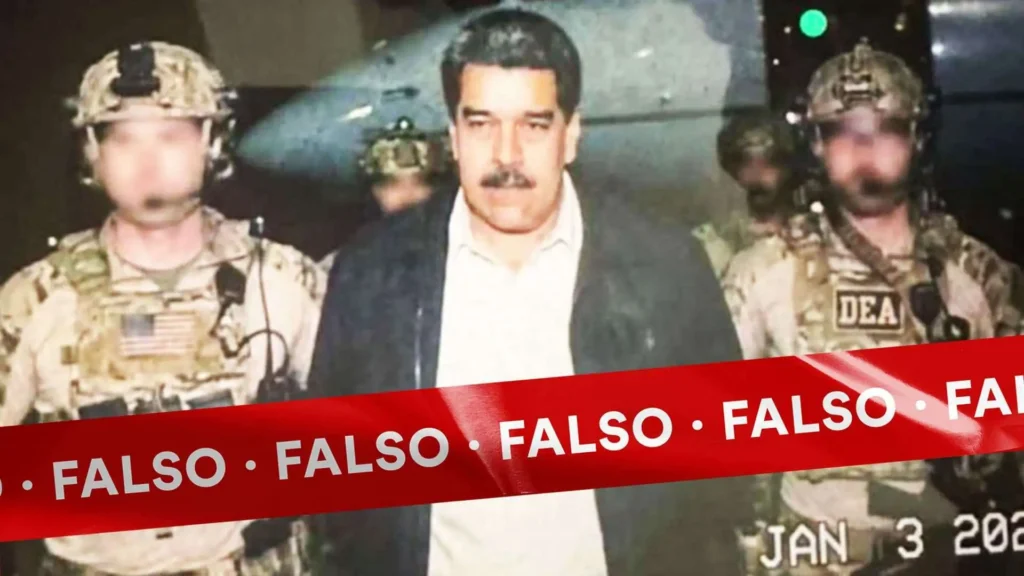 Al momento de la redacción de este desmentido se había confirmado la captura de Nicolás Maduro por agentes de las fuerzas estadounidenses. Sin embargo, la imagen en la que aparece escoltado por agentes de la DEA es un deepfake creado con inteligencia artificial generativa, cuyo origen probable sería una cuenta en X de un «entusiasta del videoarte con IA».
