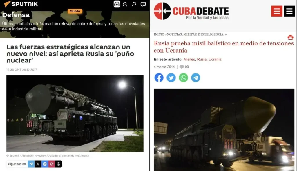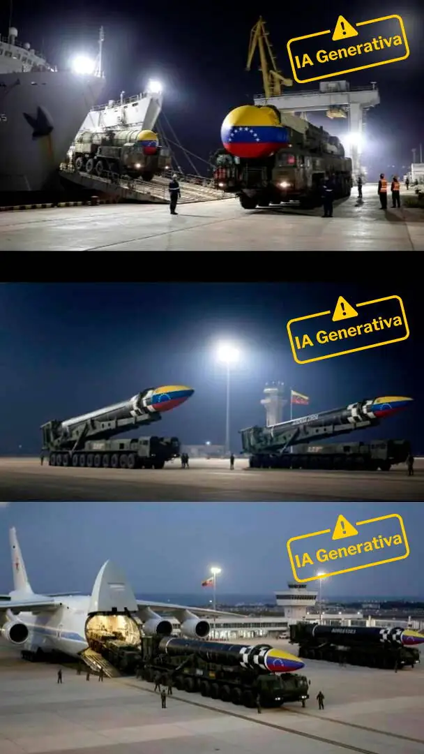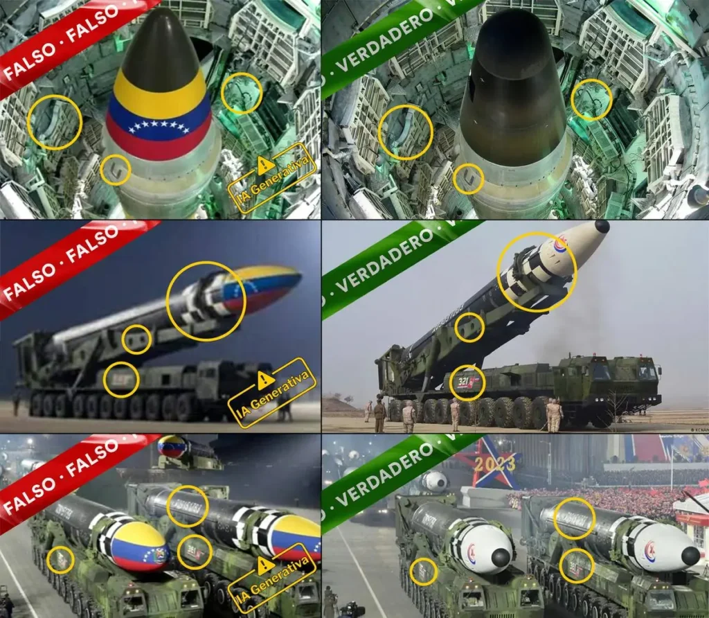Entre el armamento militar que aparece en estas fotos se aprecian ojivas presuntamente nucleares, vehículos terrestres antiaéreos y hasta cohetes espaciales. De este grupo de fotos, que provienen de la misma cuenta de TikTok, tres de ellas se hicieron virales en TikTok, X e Instagram. Haciendo búsquedas inversas a cada una de las imágenes en Google Imágenes se pudo determinar que, en efecto, la mayoría de las fotos son manipulaciones parciales con IA de fotos de armamento real, o que son imágenes totalmente generadas con IA que usaron como insumo, o se inspiraron, en fotos reales con las cuales guardan detalles similares.
