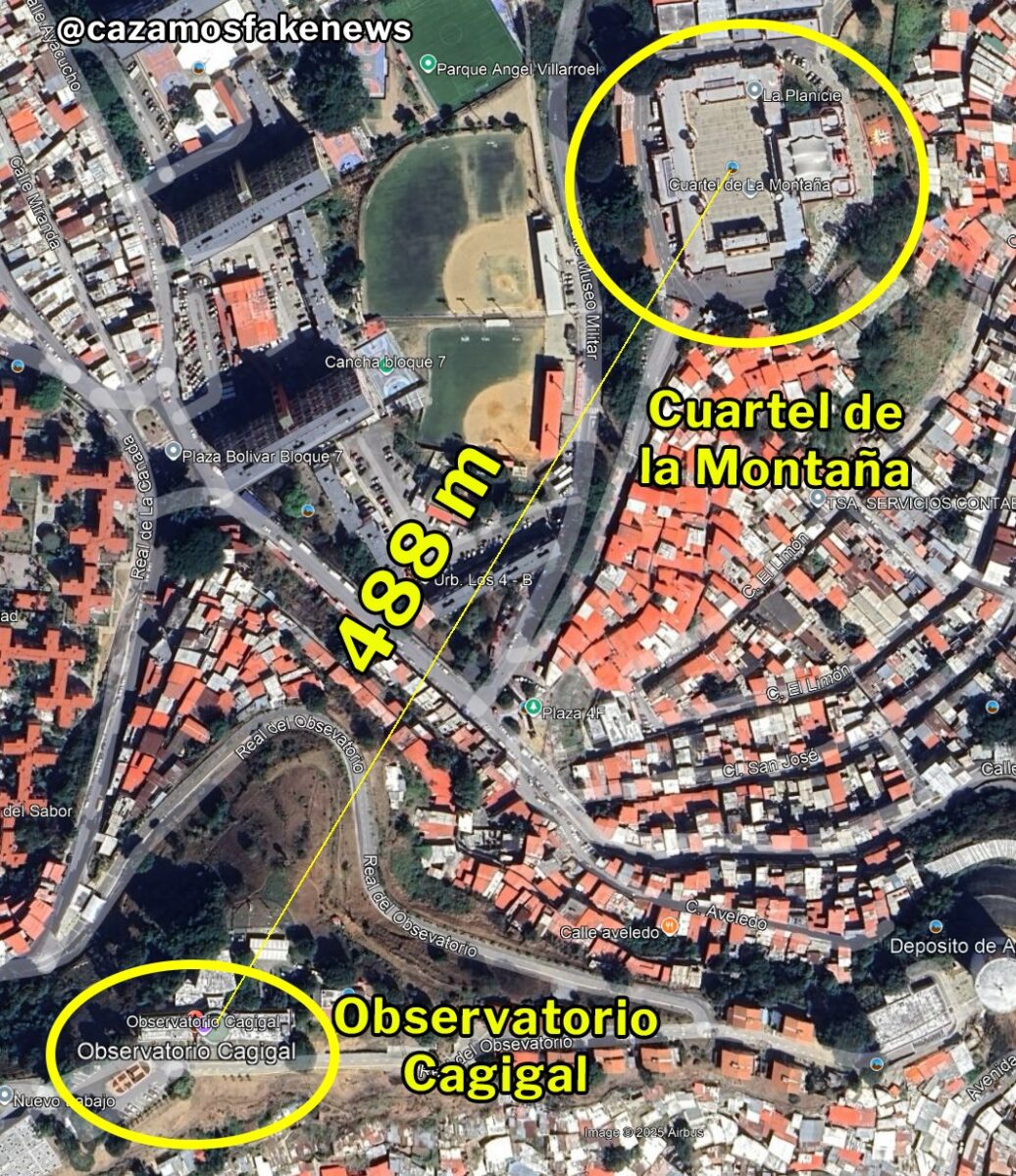 Sin embargo, tras realizar un proceso de geolocalización se determinó que la estructura que aparecen incendiada en este clip es, en realidad, el antiguo Observatorio Cagigal, que actualmente es el Comando General de la Milicia Bolivariana, ubicado a unos 500 metros de distancia del Cuartel de la Montaña 4F, también dentro de la parroquia 23 de Enero.