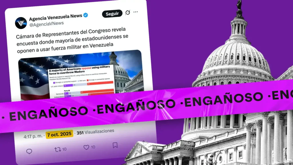 La publicación de Venezuela News se centra en solo una de las preguntas del estudio: «¿Apoyaría o se opondría a que Estados Unidos use la fuerza militar para derrocar al presidente venezolano Nicolás Maduro?» y hace una falsa atribución a la Cámara de Representantes, lo que puede sugerir erróneamente que se trata de un dato que proviene, o que está avalado, por este cuerpo gubernamental estadounidense.