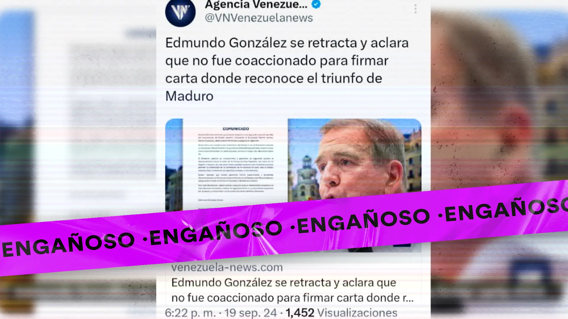 Portales web y voceros desinformantes difundieron de manera descontextualizada el comunicado publicado por el ministro de Asuntos Exteriores del Gobierno de España, José Manuel Albares, a nombre de Edmundo González Urrutia con fecha del 19 de septiembre de 2024, asegurando que el representante de la oposición venezolana “se retractó del contenido emitido en el video difundido por redes sociales y aclara que no hubo coacción alguna para firmar la carta en la que reconoce el triunfo electoral del presidente Nicolás Maduro”, reseñó el sitio web Venezuela News, un portal web alineado con el oficialismo, que regularmente difunde desinformación y propaganda.