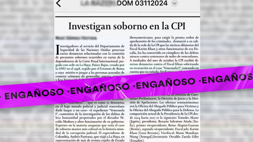 Este artículo de opinión utiliza otras narrativas engañosas en torno a la gestión de la Corte Penal Internacional y al trabajo del fiscal Karin Kham, como un supuesto conflicto de intereses por su vínculo con una de las abogadas contratada por la defensa del gobierno venezolano que CFN ya desmintió y estaba asociada al pedido de recusación realizado por la Fundación Arcadia en septiembre de 2024.