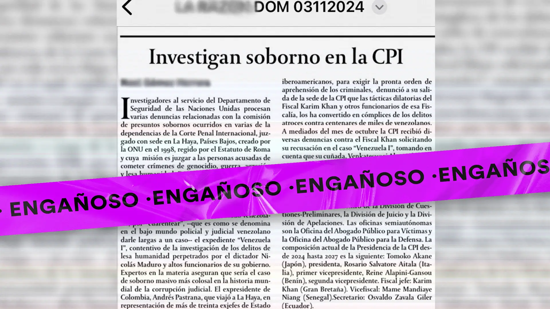 La investigación de Cazadores de Fake News determinó que la información es engañosa, no existen evidencias verificables que vinculen al UNDSS con las investigaciones mencionadas. Además, la CPI tiene su propio Mecanismo de Supervisión Independiente para manejar este tipo de denuncias internas el cual es supervisado directamente, a la vez, por las Naciones Unidas.