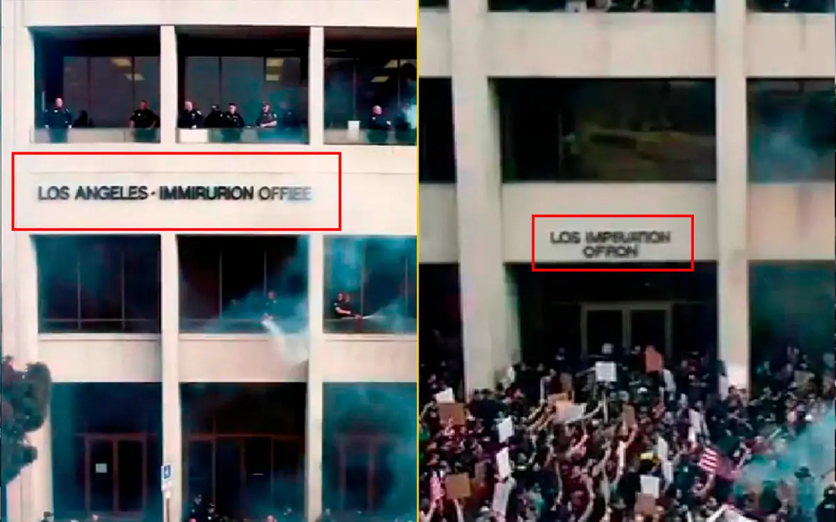 En un par de escenas se ve que en la fachada de un edificio aparece un letrero que dice “IMMGRMION OFFIEC” y “LOS ANGELES-IMMIRURION OFFIEE”, simulando el nombre de una oficina de migración. Todos estos indicios sugieren que el material fue manipulado o generado con inteligencia artificial.