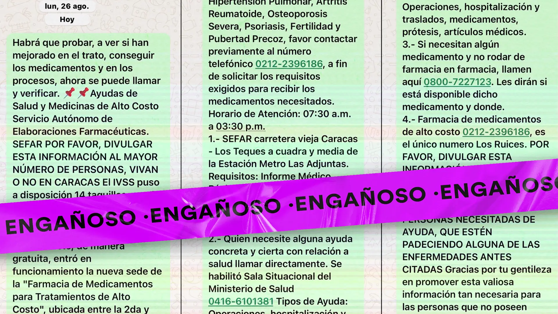 La investigación de Cazadores de Fake News determinó que la información es engañosa. Aunque sí existe el servicio de acceso a tratamientos vitales por medio de las farmacias de medicamentos de alto costo del IVSS, la información de empresas y contactos compartida en la cadena de texto es errónea.