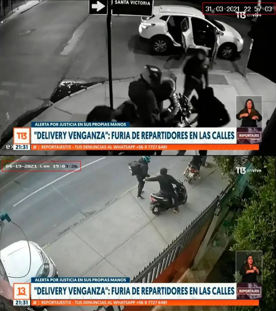 El reportaje del Canal 13 de Chile titulado “Delivery venganza: furia de repartidores en las calles”, transmitido el pasado 17 de marzo, muestra un recuento de casos en los que, según el medio, los repartidores habían “tomado la justicia por sus propias manos” en Santiago de Chile. El material audiovisual muestra imágenes de referencia de 2021 (1, 2) para respaldar la idea de que una acción que comenzó como recuperación de motos robadas se habría convertido, con el tiempo, en una práctica de “ataques coordinados en grupos de dos ruedas” contra la ciudadanía.
