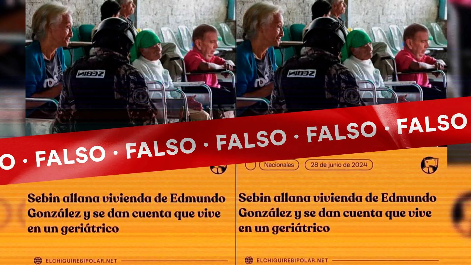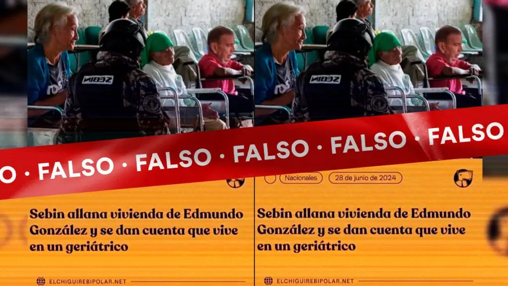 Varias cuentas de una red identificada por Cazadores de Fake News como “La Fábrica de Desinformación en Instagram” difundieron una publicación en la que, según, el portal web satírico Chigüire Bipolar escribió, y eliminó posteriormente, un artículo sobre un allanamiento a la residencia de Edmundo González Urrutia por parte del Servicio Bolivariano de Inteligencia Nacional (Sebin), cuyos funcionarios descubrieron que el sitio, supuestamente, es un geriátrico.