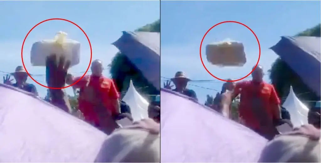 En el video se observa que el dirigente del PSUV hace un gesto para que le lancen el paquete, que luego tomó cuando cayó en la tarima