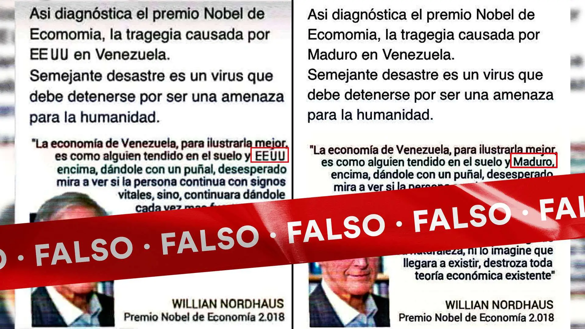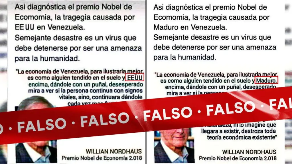 La imagen circula en la web desde octubre de 2018. Hay dos versiones de la misma frase falsamente atribuida a Nordhaus. En una, se responsabiliza de la crisis económica a Nicolás Maduro, y en otra, a Estados Unidos. En ambas versiones, el resto del texto — con errores ortográficos y de sintaxis — es idéntico. Ninguna de las versiones del bulo precisa el supuesto lugar desde el que Nordhaus pronunció la frase.