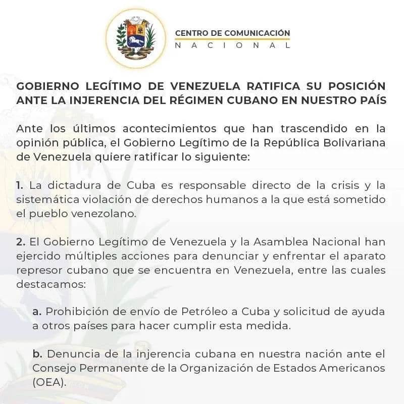 Luego de la polémica suscitada por las declaraciones en la rueda de prensa de Canadá, el Centro de Comunicación Nacional reiteró por medio de un comunicado publicado en sus redes sociales que «Cuba es responsable directo de la crisis y la sistemática violación de derechos humanos a la que está sometido el pueblo venezolano», enumeró el conjunto de acciones que ha ejecutado el gobierno interino de Juan Guaidó para denunciar y enfrentar el aparato represor cubano y reiteró que el único rol posible que pueden asumir el régimen de Cuba en Venezuela es que sus funcionarios «abandonen nuestro país y los venezolanos puedan conducir su transición a la democracia»: