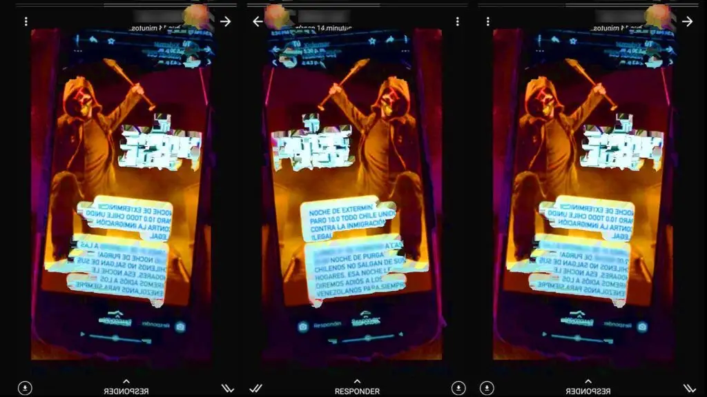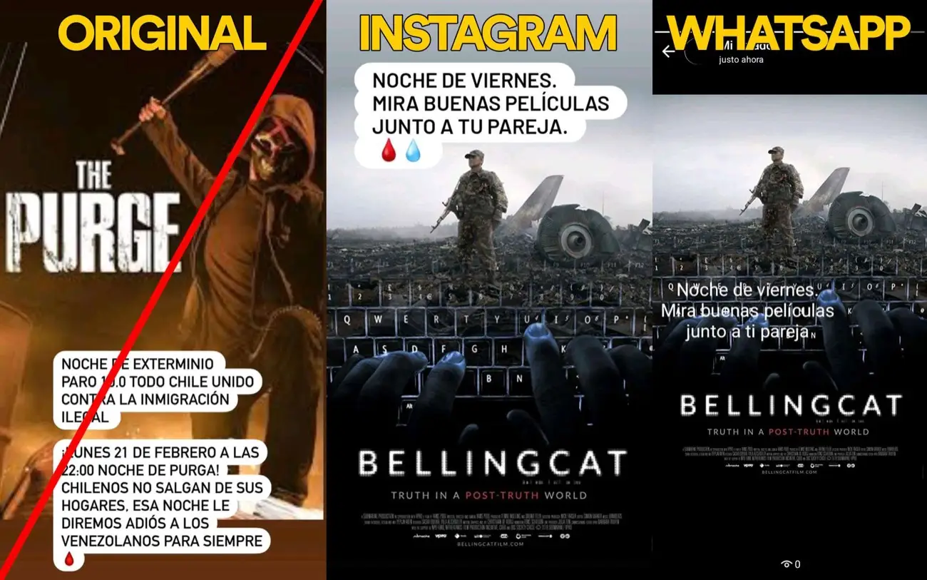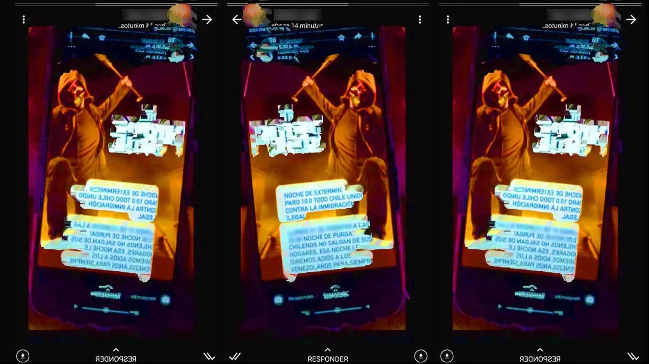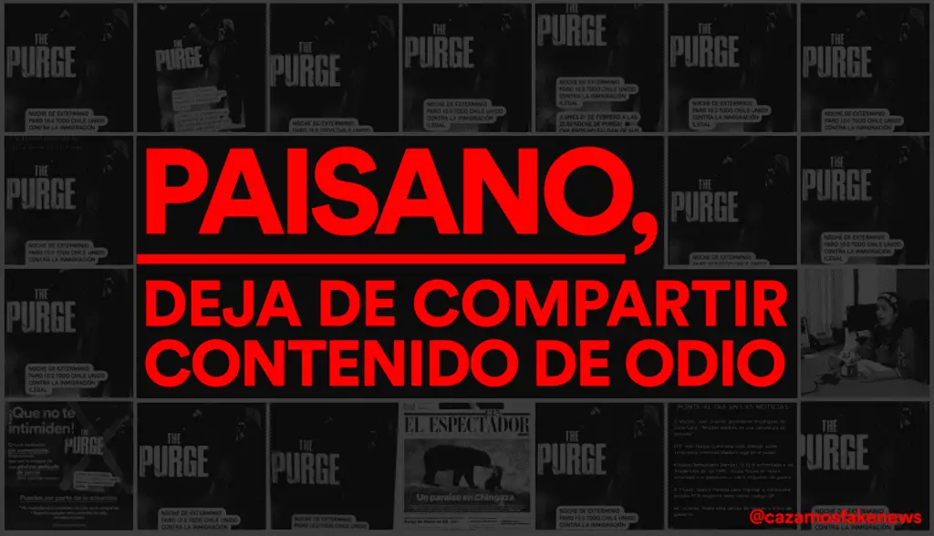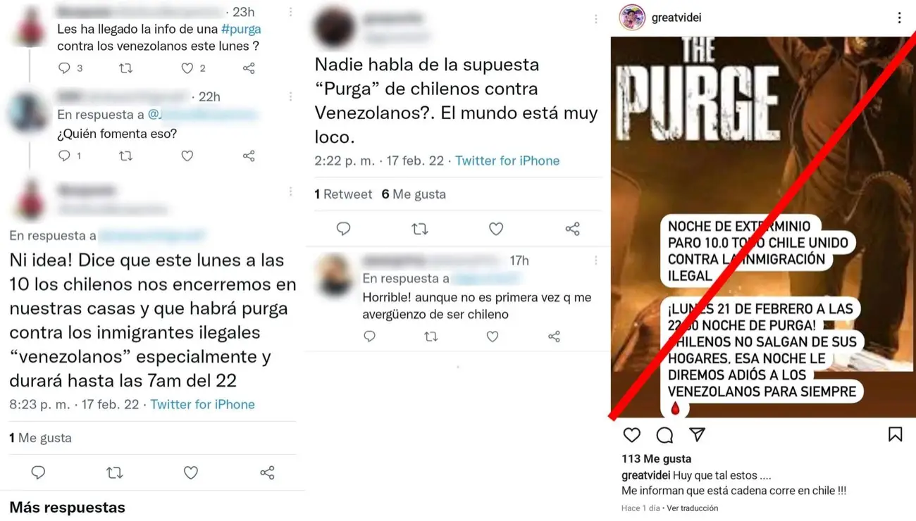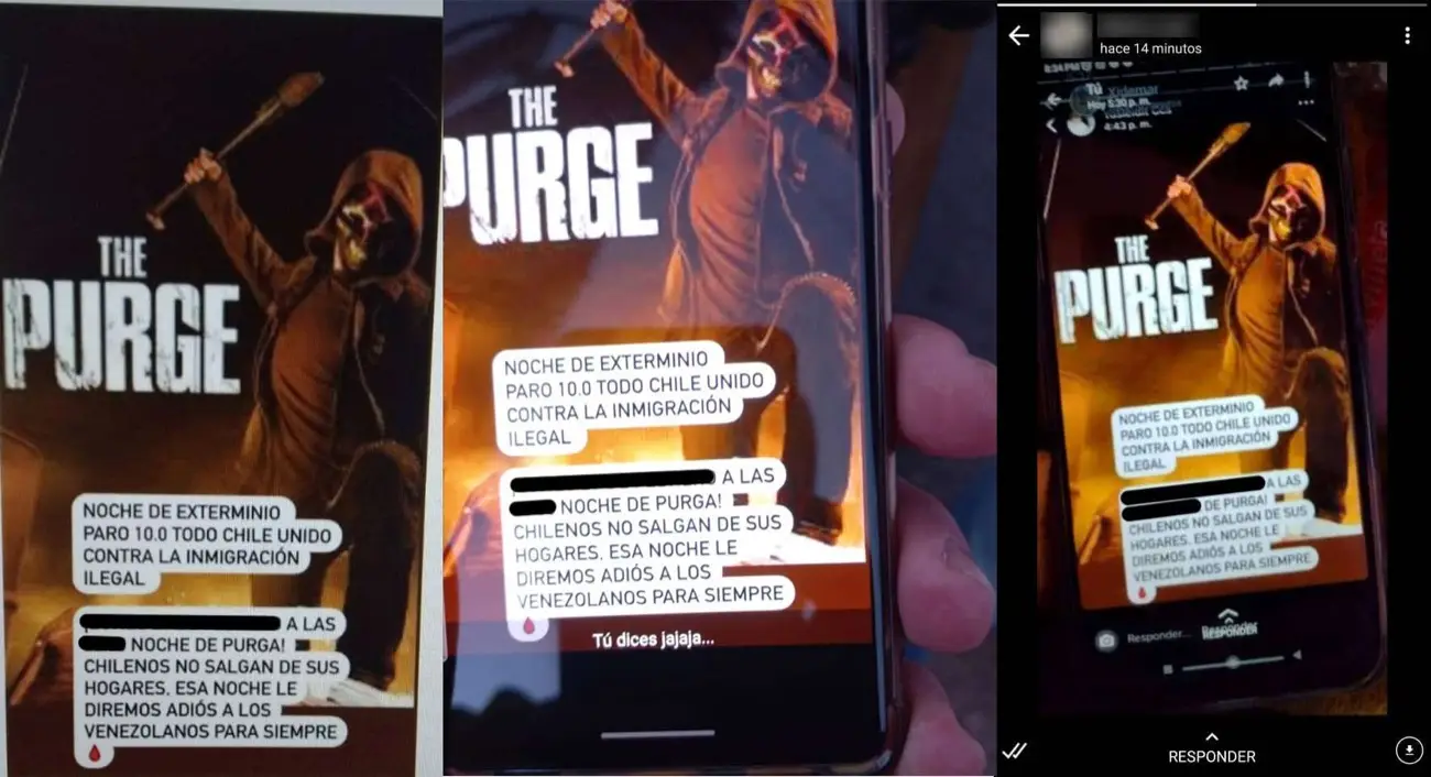 Una convocatoria sencilla y anónima sobre una supuesta «noche de exterminio» contra la inmigración «ilegal«, que ocurriría en Chile a finales de febrero. El texto finaliza con un llamado a los ciudadanos chilenos de no salir de sus hogares porque ese día se le dirá «adiós» a los venezolanos «para siempre» y va acompañado con la fotografía del póster de una producción para televisión de la franquicia de horror The Purge (La Purga).
