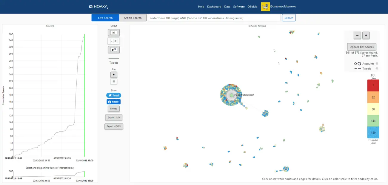 Usamos Hoaxy para realizar una búsqueda de de tweets con las palabras «venezolanos«, «migrantes» o «noche de» junto a «exterminio» o «purga» y así determinar en cuáles conversaciones se ha compartido la imagen hasta la fecha.
