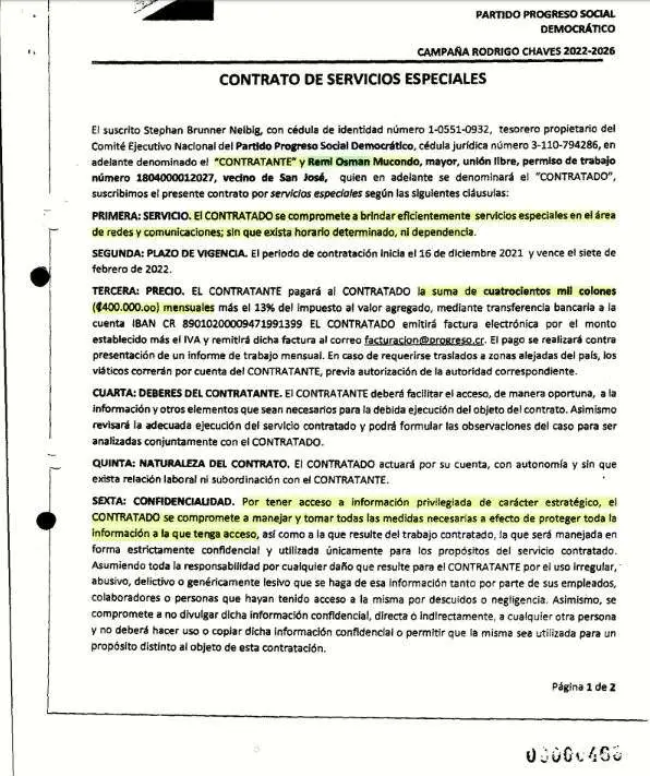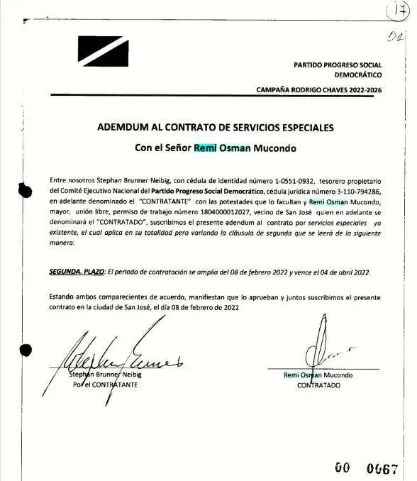 El 16 de diciembre de 2021, el Partido Progreso Social Democrático, representado por el actual vicepresidente de la república, Stephan Brunner, firmó un contrato con Remi Osman Mucondo por “servicios especiales en el área de redes y comunicaciones”. El documento forma parte de la liquidación de gastos que presentó la agrupación política ante el TSE.