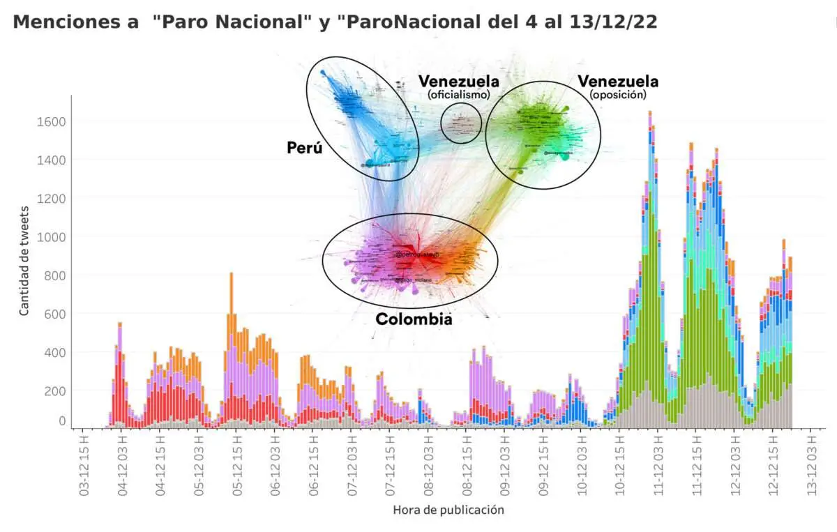 Se descargaron 82.387 tweets publicados entre el 3 y el 12 de diciembre de 2022 y se observó que, adicionalmente a la gran cantidad de menciones a la frase “Paro Nacional” y a la etiqueta #ParoNacional observada en Venezuela a partir del 10 de diciembre, ambos términos ya habían venido siendo impulsados en Colombia y Perú. En el primer caso con motivo de la cercanía al aniversario del Paro Nacional de 2019 en Colombia y en el caso del Perú, debido al Paro Nacional convocado en el contexto de la inestabilidad política generada tras la reciente destitución del expresidente Pedro Castillo.