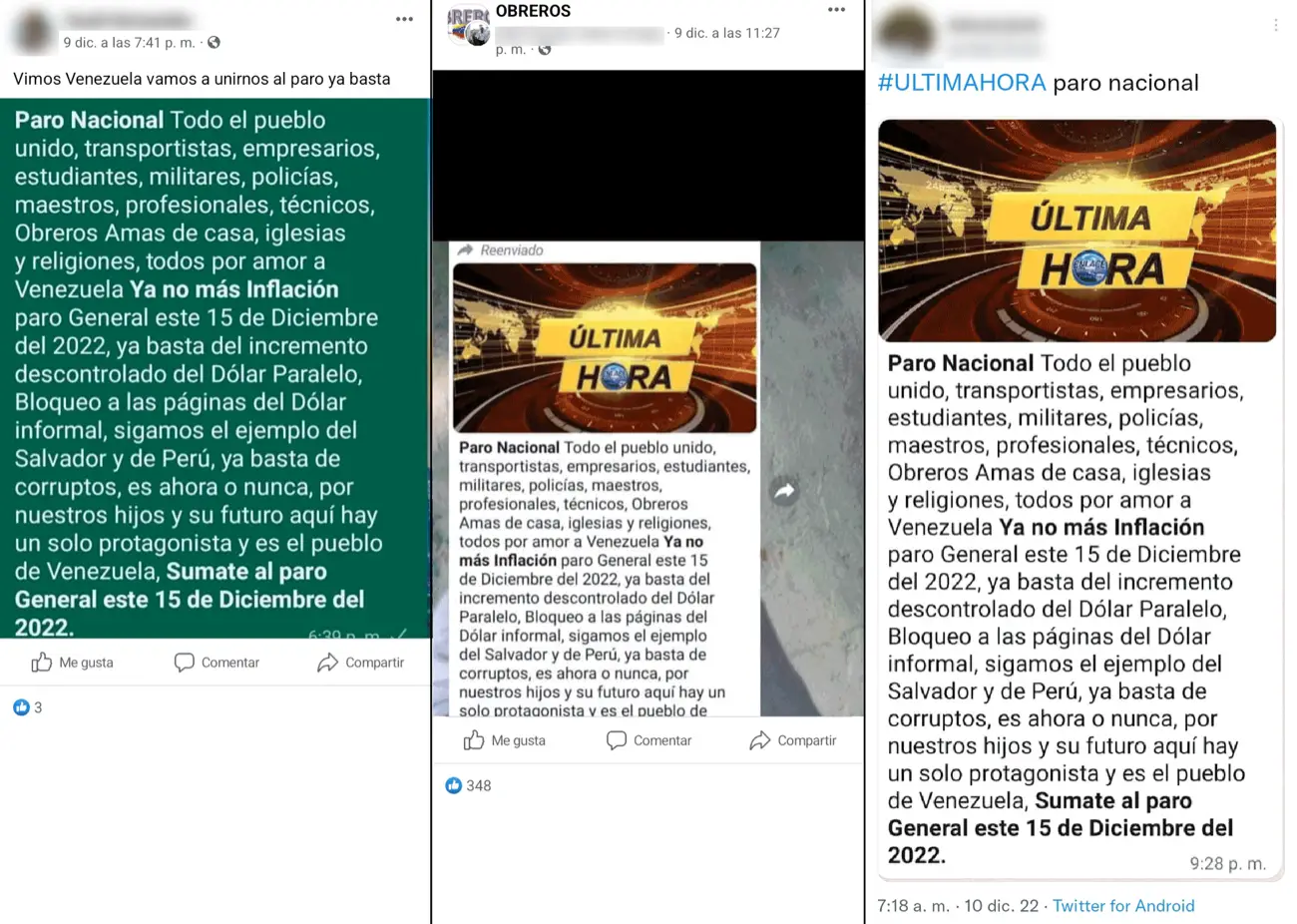 Desde el 9 de diciembre de 2022 ha circulado en Facebook, Twitter, TikTok y mensajería instantánea (WhatsApp) la convocatoria a un falso Paro Nacional en Venezuela, que habría sido pautado para el 15 de diciembre del 2022.