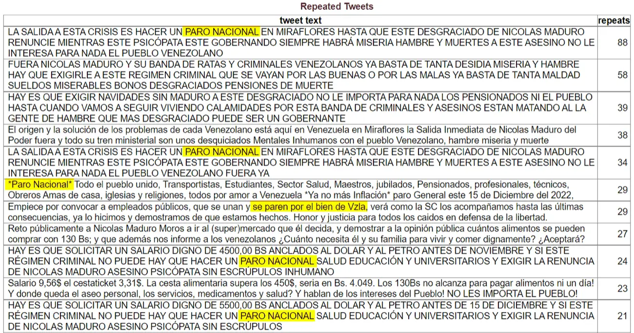 Una minoría de cuentas de Twitter generó spam, con el fin de amplificar la cantidad de contenido sobre la falsa convocatoria. Entre los casos detectados, se observó a una cuenta anónima que entre el 10 y el 14 de diciembre publicó 238 tweets, justificando la convocatoria de Paro Nacional.