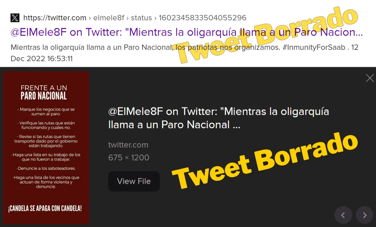 En cuanto al contenido del tweet en cuestión que publicó @ElMele8F el 12 de diciembre, tenía una oración sencilla: «Mientras la oligarquía llama a un Paro Nacional, los patriotas nos organizamos. #InmunityForSaab», junto con un anuncio que decía: