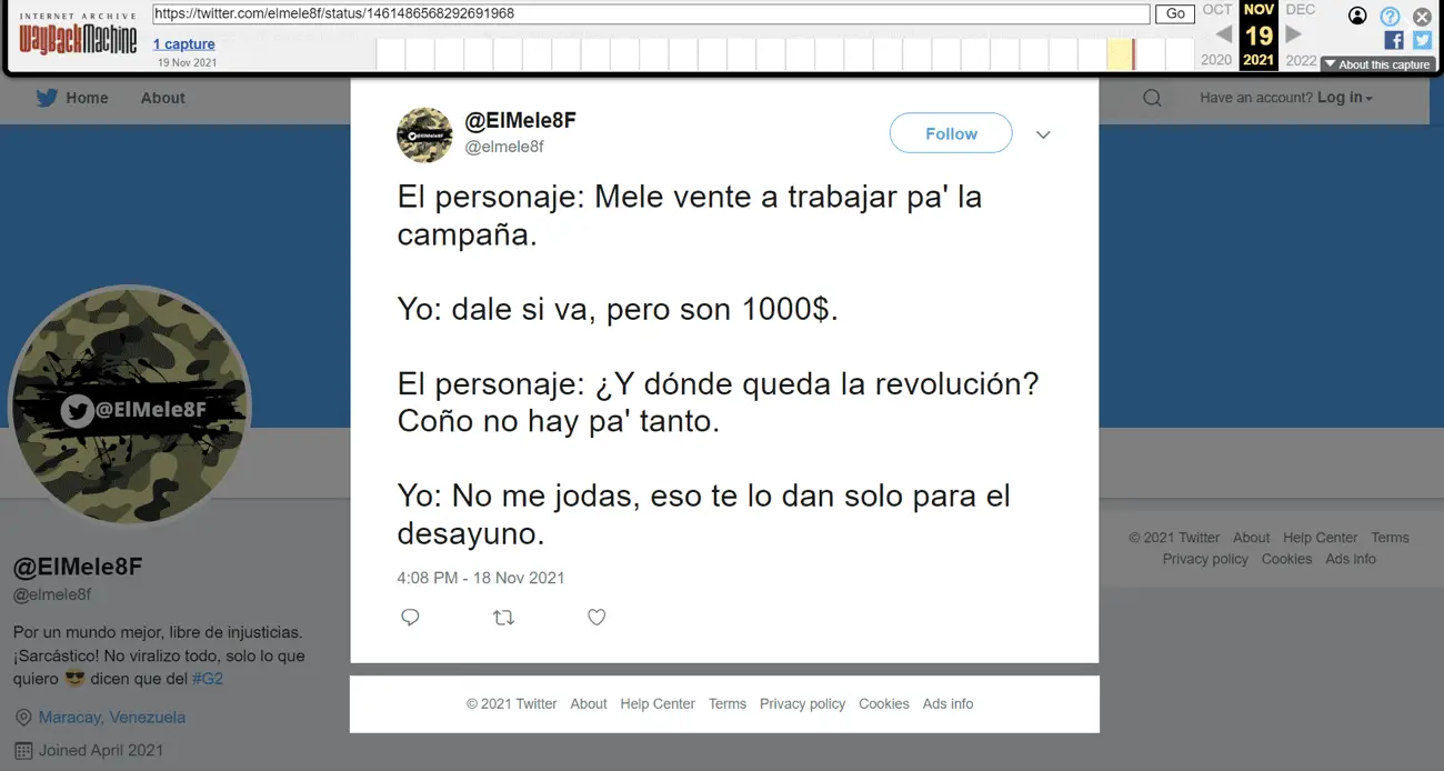 Otro de los tweets borrados por la cuenta anónima, cuando aún se llamaba @ElMele8F fue publicado el 18 de noviembre de 2021 y está archivado en la Wayback Machine. En él, el autor simuló un diálogo en el que alguien lo invita a participar en una campaña política de “la revolución”. Este tweet reveló el apodo del operador de la cuenta, «Mele», y también permitió confirmar que el individuo detrás de la cuenta no es un denunciante espontáneo ni un usuario casual de Twitter, sino alguien con conocimientos en comunicación digital.