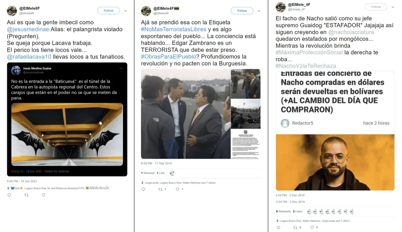 En los tres casos se observa el mismo patrón: acusaciones contra periodistas y reporteros como Jesús Medina Ezaine, expreso político, y acusaciones de terrorismo a otros actores, como Edgar Zambrano, también expreso político. Hay indicios de su participación en el impulso de la campaña #NachoVzlaTeRechaza, una etiqueta impulsada de forma no auténtica en contra del popular cantante venezolano Ignacio “Nacho” Mendoza que se llevó a cabo en dos oportunidades, el 23 de septiembre de 2018 y el 3 de diciembre de 2019.